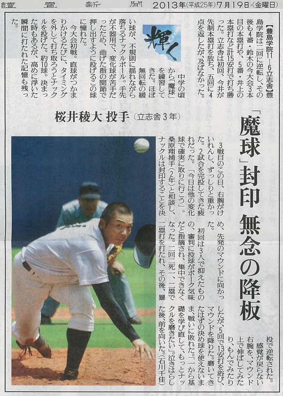 ▲立志舎高校の桜井稜大投手が読売新聞に掲載されました