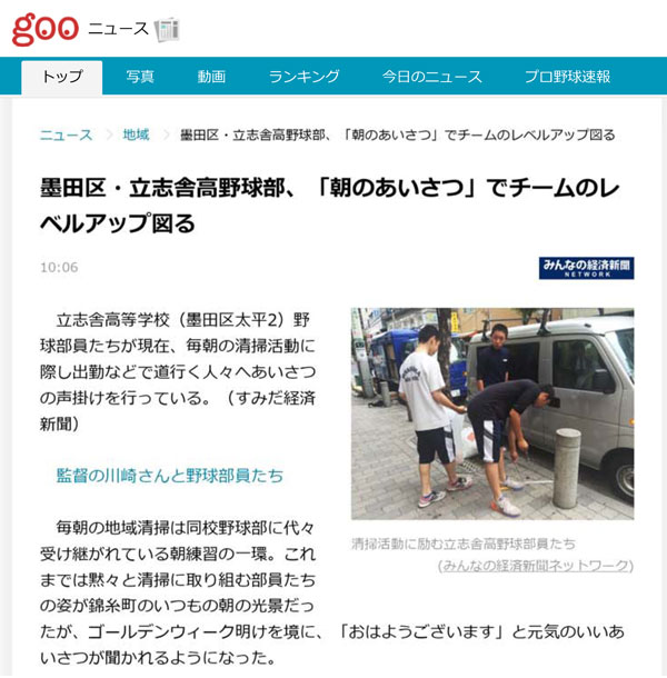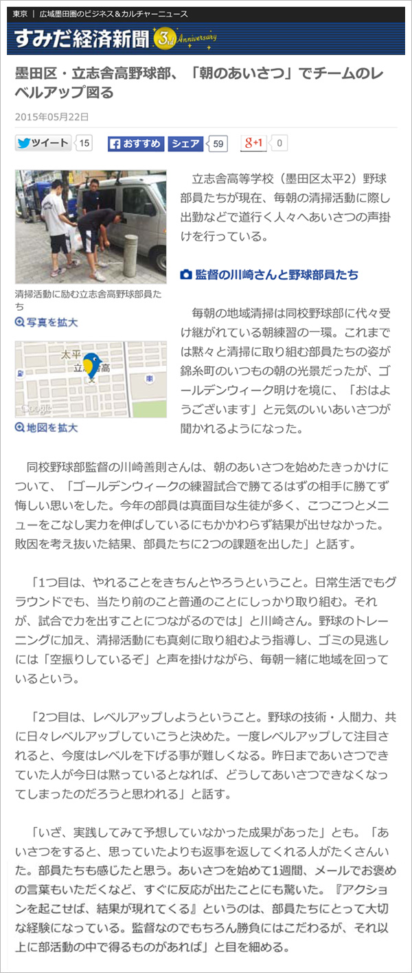クラブ 野球部 立志舎高校野球部 朝の清掃、あいさつがすみだ経済新聞に掲載されました 2015年5月22日 立志舎高校野球部の毎朝の清掃活動とあいさつの声掛けが「すみだ経済新聞」に掲載されました。 post