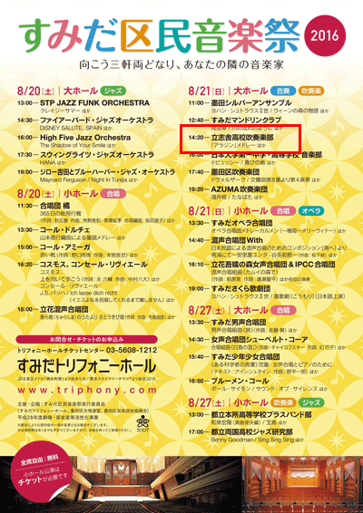 8月21日(日)吹奏楽部はすみだトリフォニーホールで行われる「すみだ区民音楽祭」に出演します。