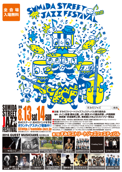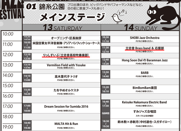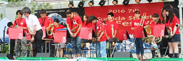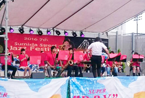 8月13日土曜日、吹奏楽部は「すみだストリートジャズフェスティバル」のメインステージでライブを行いました。すみだストリートジャズフェスティバルは地元錦糸公園を中心に錦糸町一帯で開催される大きなイベントです。吹奏楽部がこのフェスティバルで演奏するのは恒例となっていて部活動の大事な活動のひとつになっています。会場のみなさんの応援にも助けられながら、夏の暑さに負けない熱いステージを展開することができました。
