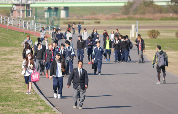 12月6日(火)江戸川河川敷で強歩大会が行われました。強歩大会は三郷から柴又までの約10kmを歩く大会です。スピードを競ったり、ゆっくりと冬の河川敷の空気を楽しんだり、数時間を友達とわいわい話しながら歩いたりと、おもいおもいのペースで大会に参加していました。今年は晴天に恵まれ、生徒たちは元気いっぱいに一日を楽しんでいました。
