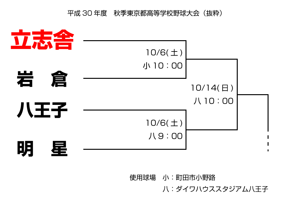平成30年秋季東京都高等学校野球大会本大会の、立志舎高校野球部の初戦が平成30年10月6日(土)町田市小野路球場にて行われます。初戦の相手は岩倉高校です。最後まで全力で戦いますので、在校生のみなさん、地域のみなさまの力強い応援をよろしくお願いします。