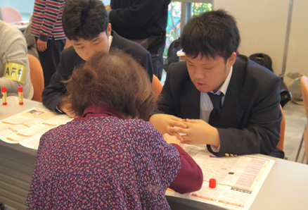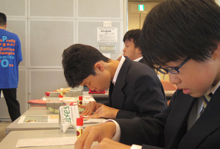 当日本校の生徒は千代紙を使ったカードケース、手帳ケースを作成するコーナーの手伝いを担当し、訪れた方がケースを作るサポートをしました。様々な方が訪れるので、口で伝えることが難しかったり、上手く作れなかったりもしましたが、伝え方を工夫するなど、一生懸命活動しました。