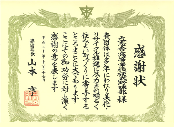 立志舎高校硬式野球部は日頃からの地域の清掃活動を評価され、「美化・リサイクル部門」に選ばれました。